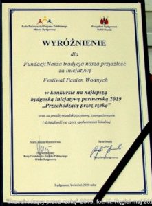 Prezydent Miasta Bydgoszczy i Rada Działalności Pożytku Publicznego Miasta Bydgoszczy przyznali w konkursie „Przechodzący przez rzekę” wyróżnienie za realizację Festiwalu Panien Wodnych w kategorii „Na najlepszą inicjatywę partnerską 2019 roku”. Partnerem Fundacji był Kujawsko-Pomorski Specjalny Ośrodek Szkolno-Wychowawczy nr 2 w Bydgoszczy.